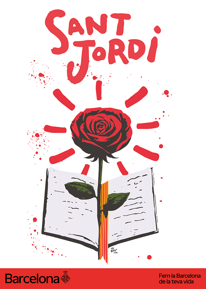 Beyond the streets and the atmosphere, Sant Jordi also finds expression through visual culture. Each year, the city commissions an official poster that captures the spirit of the celebration, and in 2026, urban artist TVBoy offers a contemporary interpretation—blending love, literature, and the iconic symbolism of the day into a bold, unmistakably urban aesthetic.