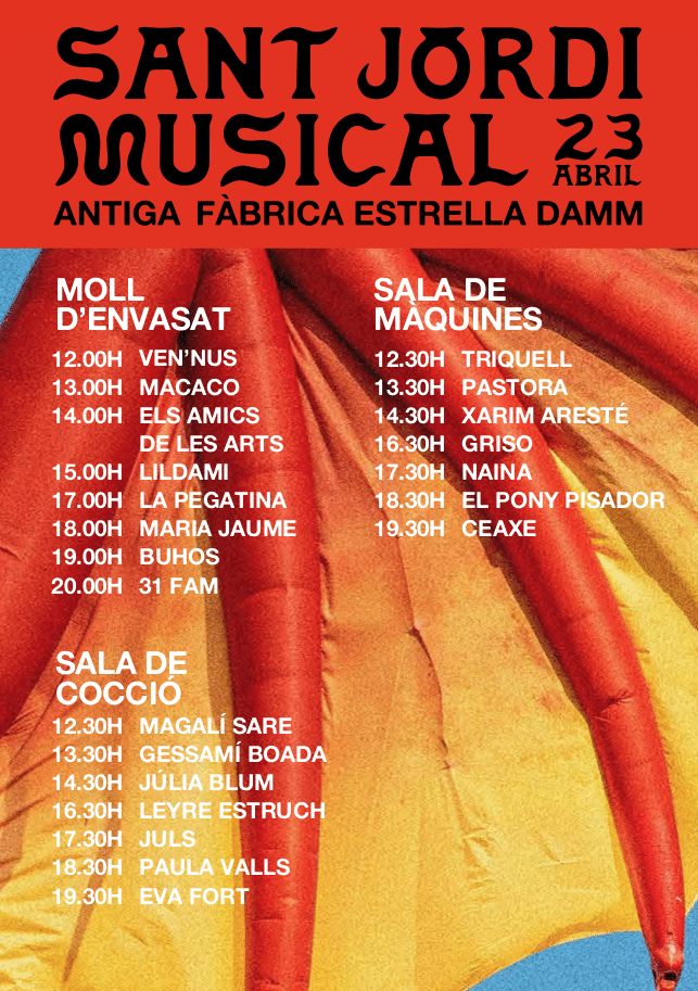 Throughout the day, Barcelona hosts a wide range of cultural activities that extend far beyond book stalls. One of the most notable examples is the Sant Jordi Musical event, held at the Antiga Fàbrica Estrella Damm. This former industrial space becomes a lively cultural hub, offering free concerts by well-known artists such as Macaco or La Pegatina, among others. It introduces a completely different energy to the day, blending literature with live music and a younger, more festive crowd.